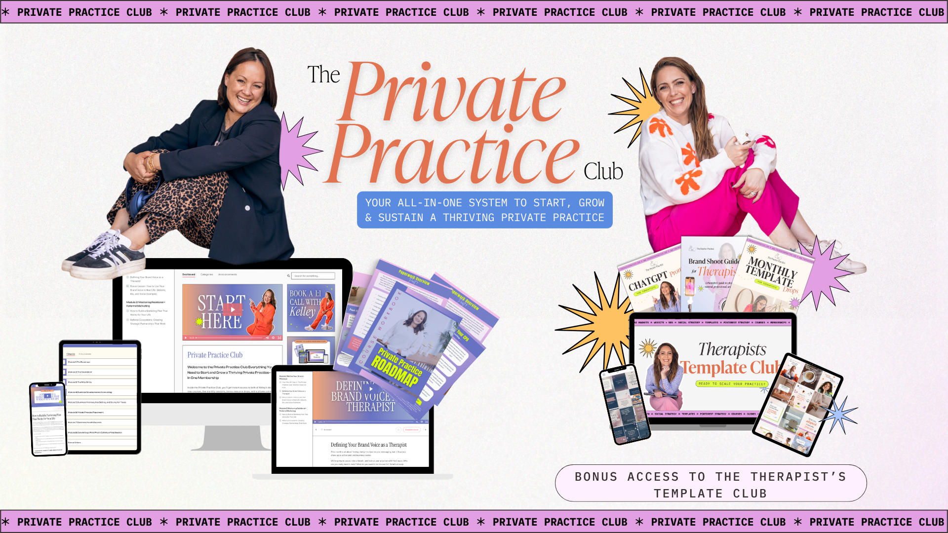 Created by Kelley Stevens, LMFT (founder of The Private Practice Pro) and supported by Amanda Smith (founder of The Passive Practice), this membership gives you everything you need to launch or grow your practice all in one place.